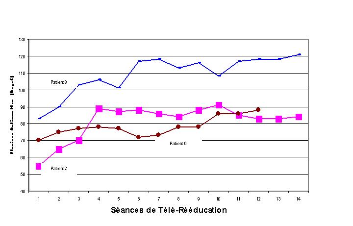 Une fois l'équipement installé au domicile, aucun patient n'a abandonné l'étude. La compliance aux douze télé-séances dans le mois qui a suivi la sortie de l'hôpital est de 95,4% (103 séances sur 108 préVues dans le mois de télé-suivi). De plus, les données rapportées dans le cahier d'observation par l'assistant en physiothérapie et mémorisées automatiquement par l'ordinateur (date; heure de début et de fin d'utilisation), identifient un total de séances supplémentaires de + 2, 2, 4 et 9 pour quatre patients. Ces séances sont optionnelles, récréatives ou inter-culturelles et offrent des opportunités d'activités inter-générations au sein du Village Virtuel PACE 2000. La durée des séances de télé-rééducation peut varier de 12 à 68 minutes mais se stabilise typiquement à des séances de 15 à 25 minutes à partir de la deuxième semaine de télé-suivi.