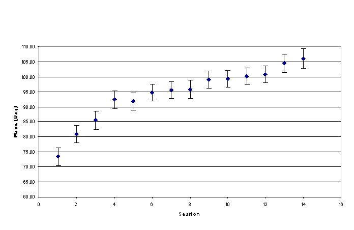 articulaire du genou mesurée sur le GAV trois fois par semaine permet la production de courbes individuelles (figure 2) ou collectives (figure 3 et tableau 4). L'analyse de variance des moyennes des amplitudes de flexion active des quatorze séances est hautement significative (F = 34,34; risque a< 0,001). Autre observation: La moyenne des amplitudes maximales de flexion active du genou en post-opératoire croît jusqu'à la quatorzième et dernière séance (moyenne=106°± 3,24).